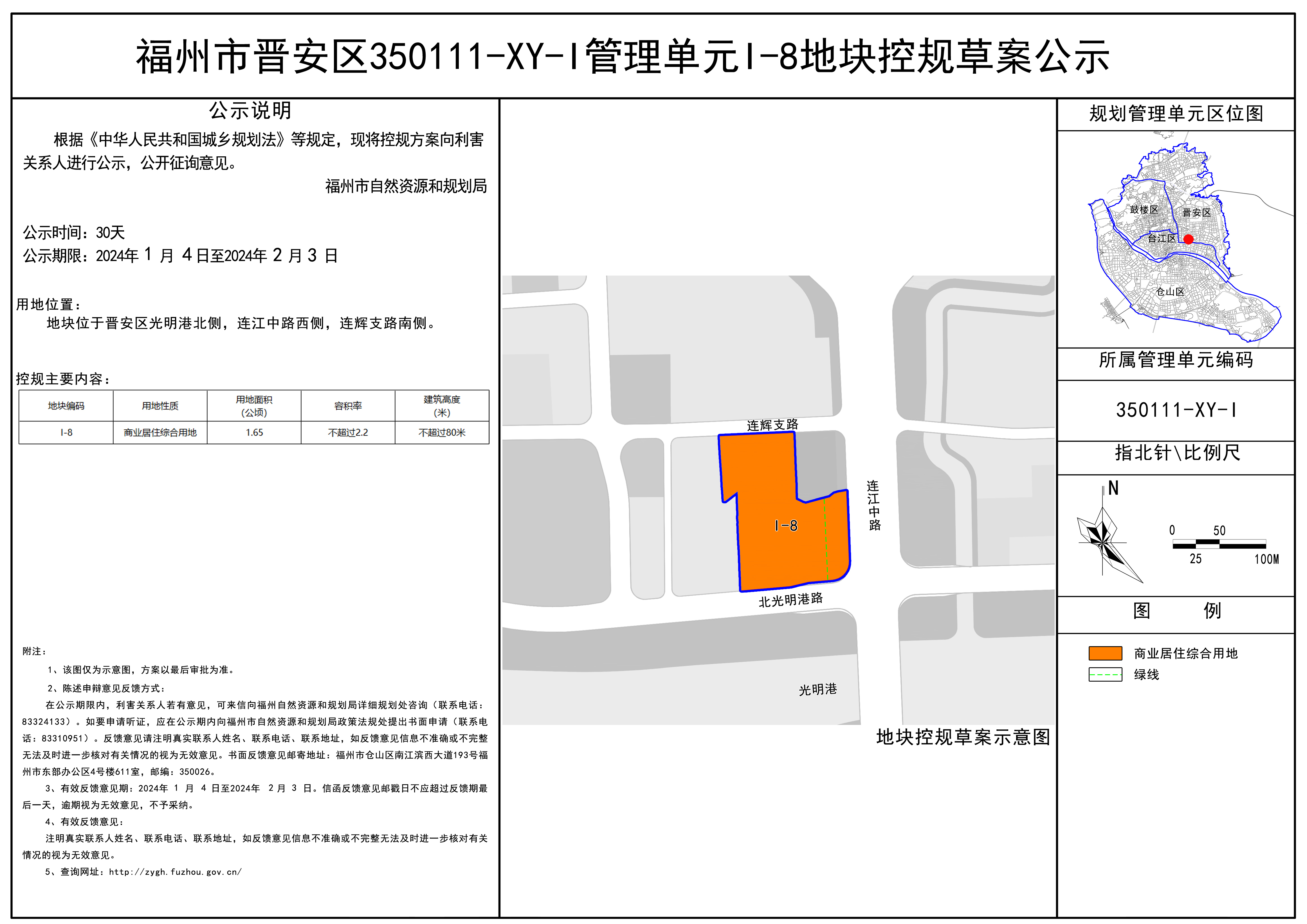 晋安区350111-XY-I管理单元I-8等地块位于晋安区光明港北侧连江中路西侧,连辉支路南侧。该控规草案经研究审议,根据《中华人民共和国城乡规划法》等相关规定,现征求利害关系人意见,公示时间20241月4日至2024年23,详情可查阅网站(http://zygh.fuzhou.gov.cn)。