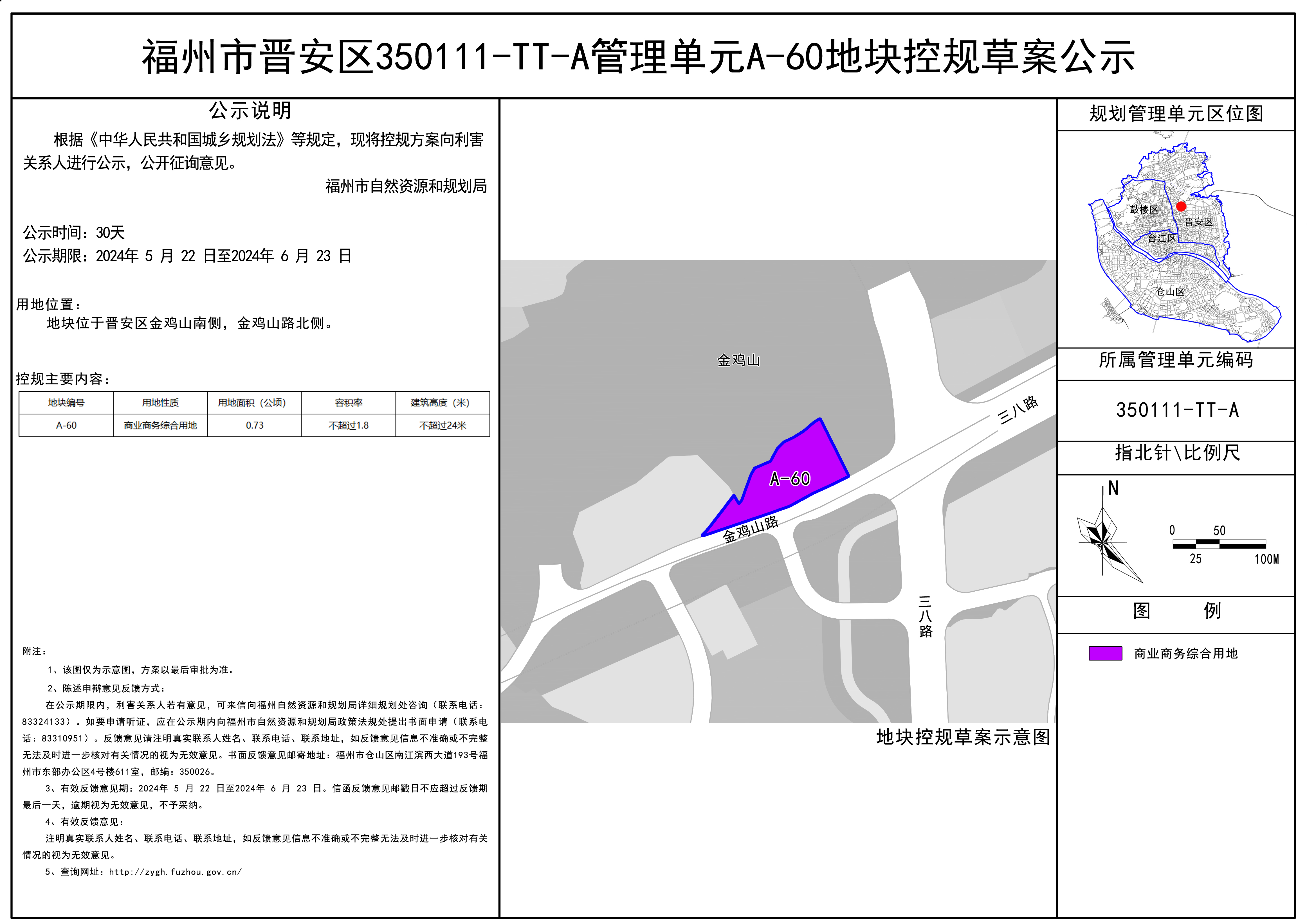 晋安区350111-TT-A管理单元A-60地块位于晋安区金鸡山南侧、金鸡山路北侧。该控规草案经研究审议,根据《中华人民共和国城乡规划法》等相关规定,现征求利害关系人意见,公示时间2024年5月22日至2024年6月23日,详情可查阅网站(http://zygh.fuzhou.gov.cn)。