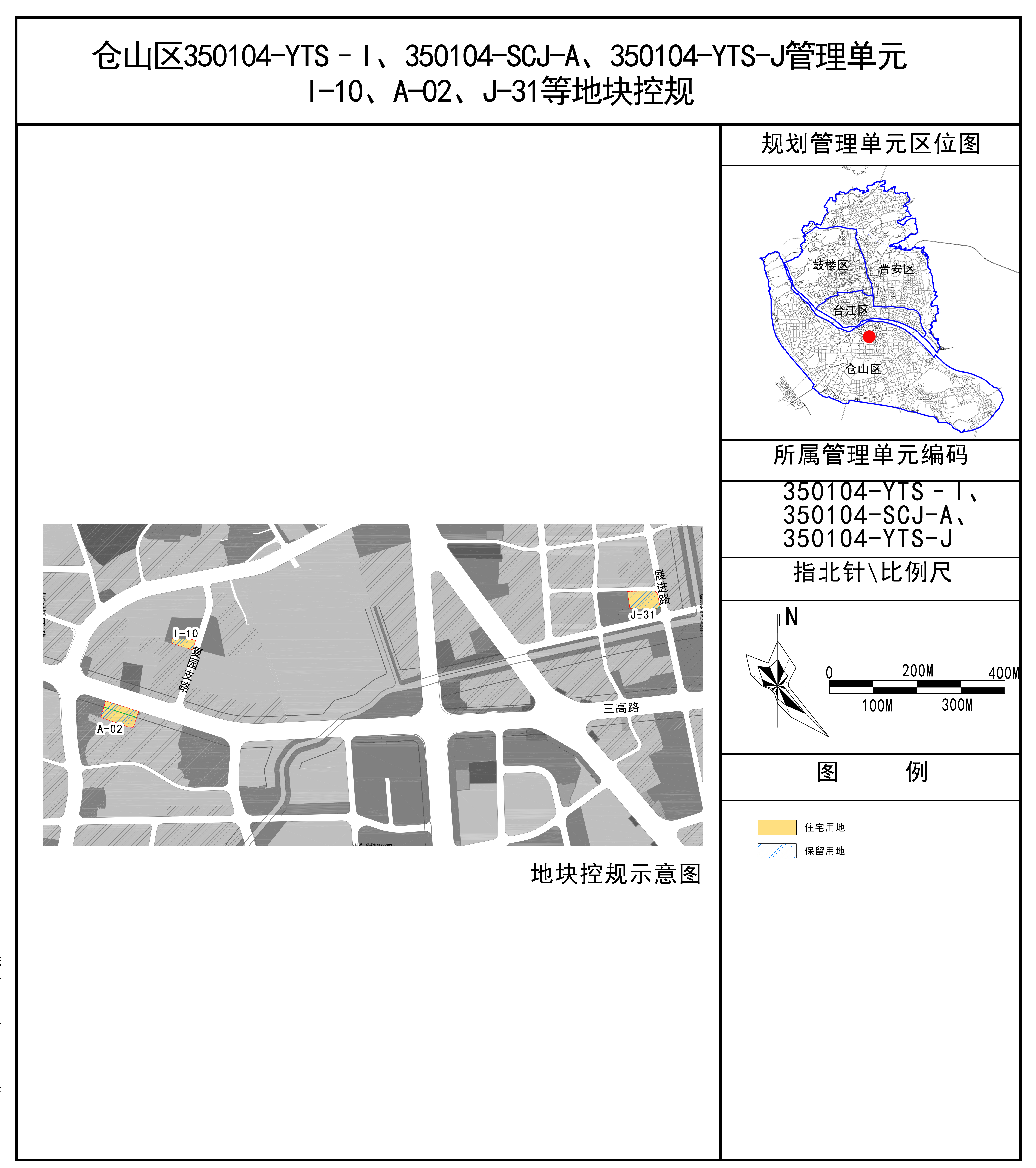 福州市仓山区350104-YTS-I、350104-SCJ-A、350104-YTS-J管理单元I-10、A-02、J-31等地块控规已经法定程序获得福州市人民政府批复,根据《中华人民共和国城乡规划法》等有关规定,现将经市政府批准的规划予以公布。