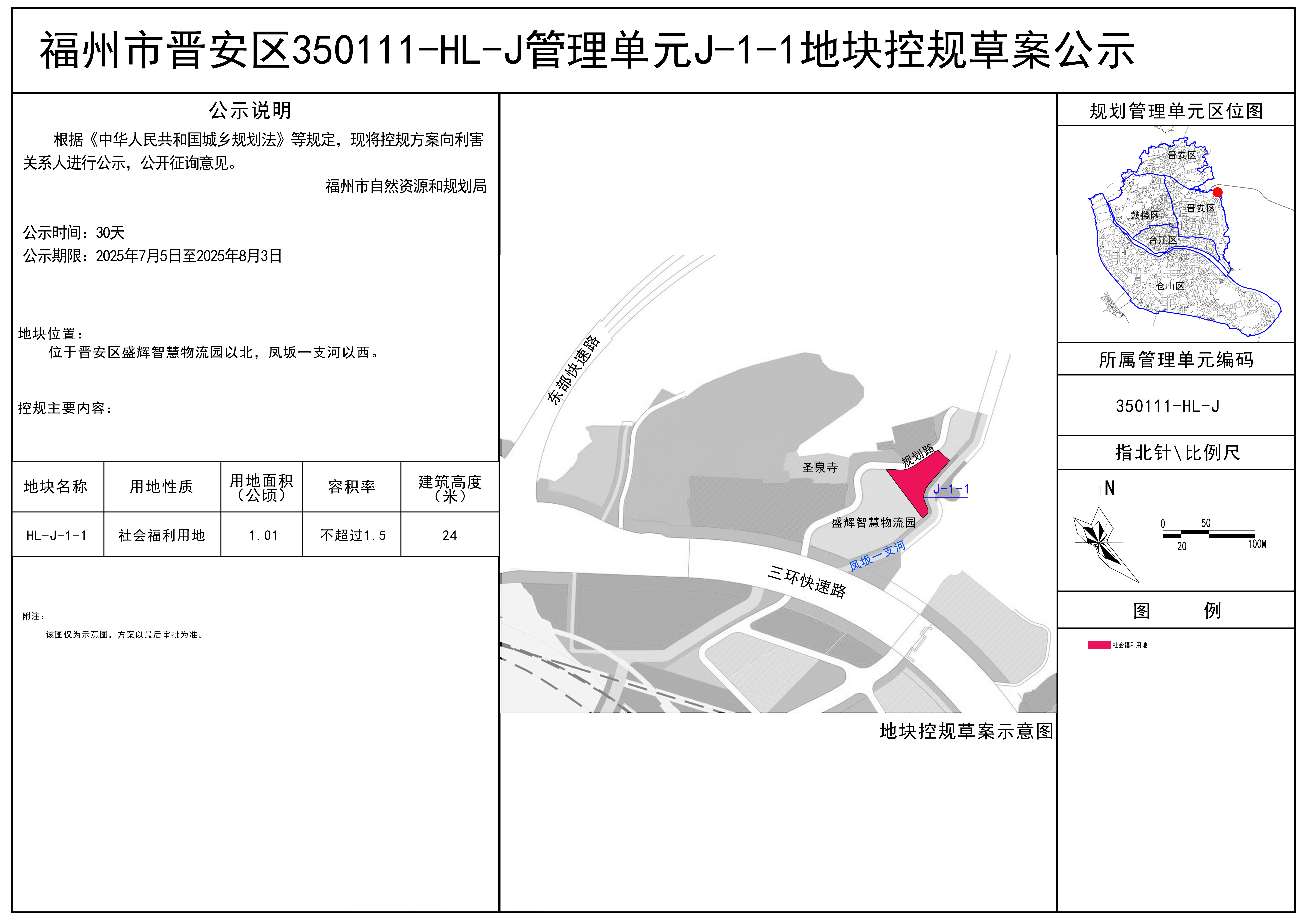 晋安区350111-HL-J管理单元J-1-1地块位于晋安区盛辉智慧物流园以北,凤坂一支河以西。该控规草案经研究审议,根据《中华人民共和国城乡规划法》等相关规定,现广泛征求社会各界意见,公示时间2025年7月5日至2025年8月3日,详情可查阅网站(http://zygh.fuzhou.gov.cn)。