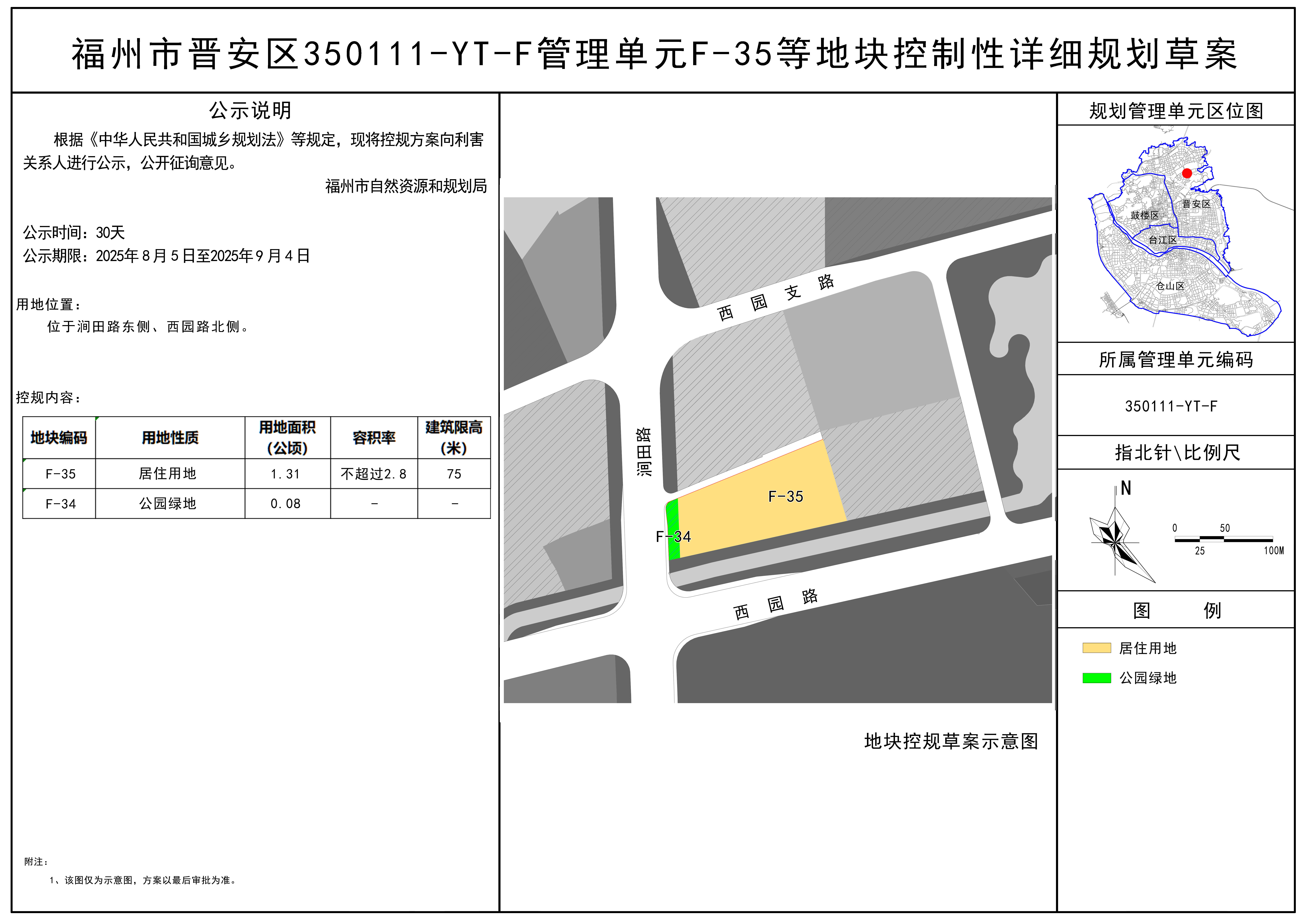 晋安区350111-YT-F管理单元F-35等地块位于涧田路东侧、西园路北侧。该控规草案经研究审议,根据《中华人民共和国城乡规划法》等相关规定,现广泛征求社会各界意见,公示时间2025年8月5日至2025年9月4日,详情可查阅网站(http://zygh.fuzhou.gov.cn)。