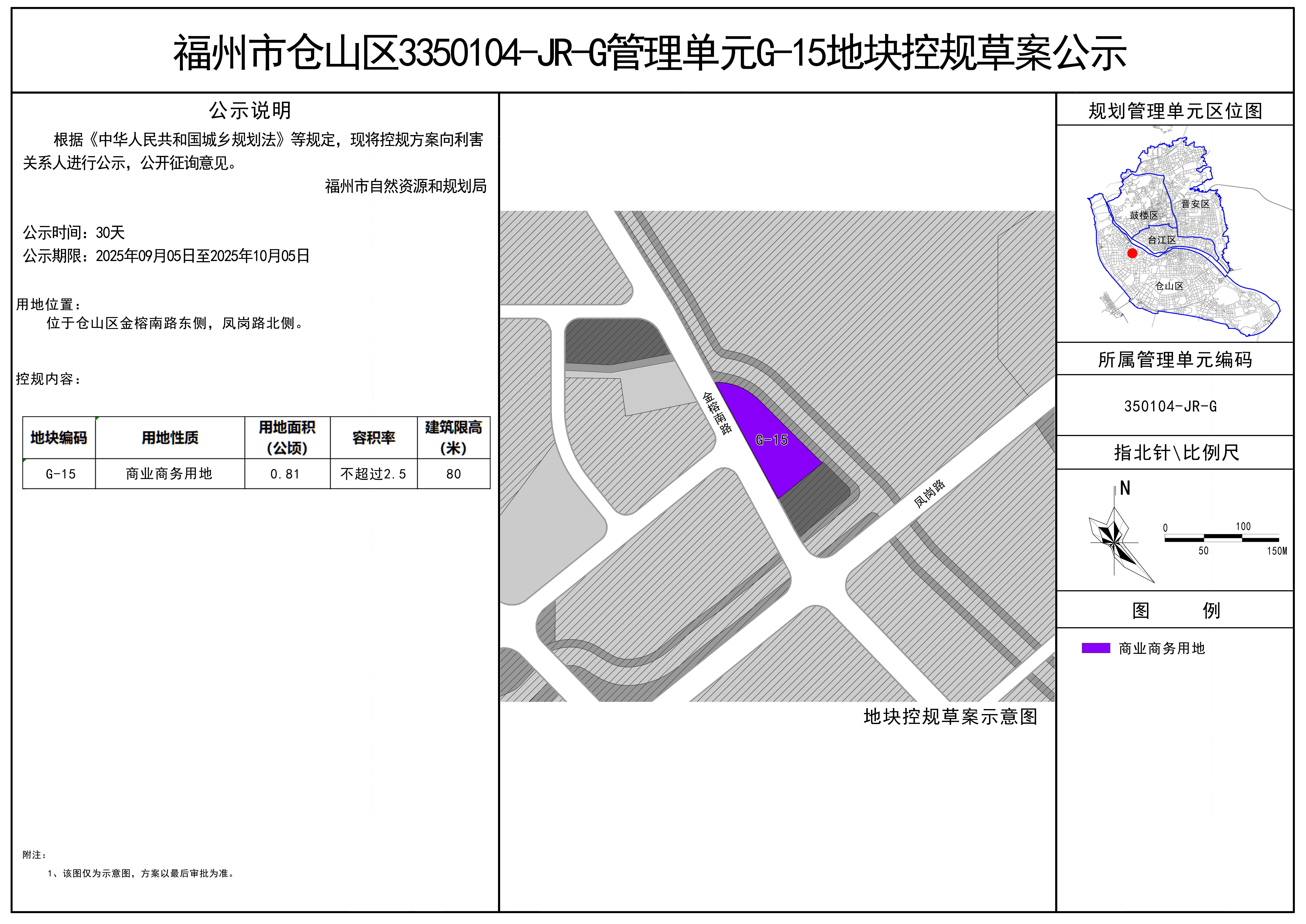 1.在公示期满后,福州市自然资源和规划局将于2025年10月9日上午9:30,在东部办公区4号楼507会议室召开控规草案听证会,收到听证通知的群众应按时参加听证会,否则视为放弃听证。