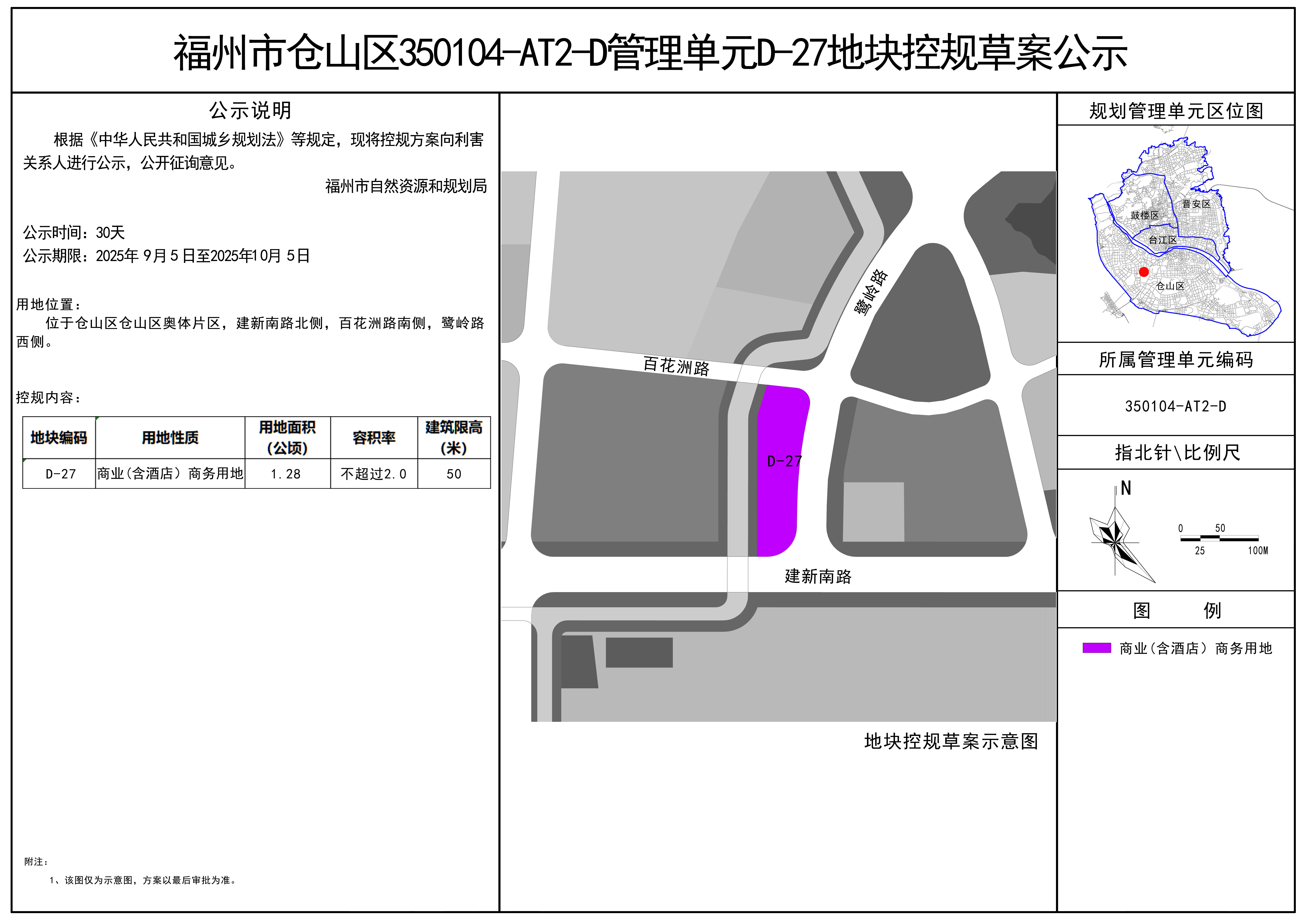 仓山区350104-AT-D管理单元D-27地块控制性详细规划位于百花洲路南侧、建新南路北侧、鹭岭路西侧。该控制性详细规划草案经研究审议,根据《中华人民共和国城乡规划法》等相关规定,现广泛征求社会各界意见,公示时间2025年9月5日至2025年10月5日,详情可查阅网站(http://zygh.fuzhou.gov.cn)。