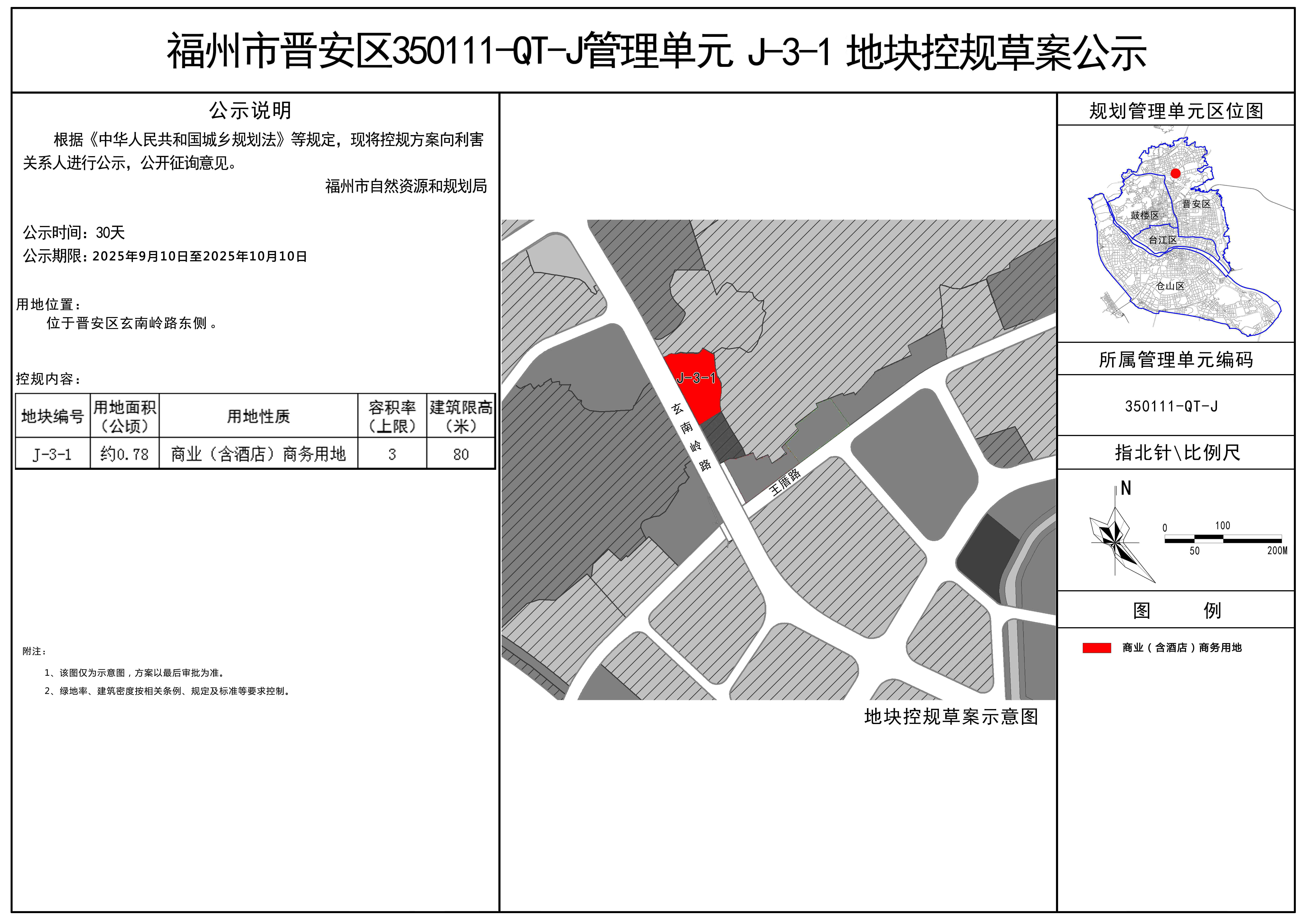 晋安区350111-QT-J管理单元J-3-1地块位于玄南岭路东侧。该控规草案经研究审议,根据《中华人民共和国城乡规划法》等相关规定,现广泛征求社会各界意见,公示时间2025年9月10日至2025年10月10日,详情可查阅网站(http://zygh.fuzhou.gov.cn)。