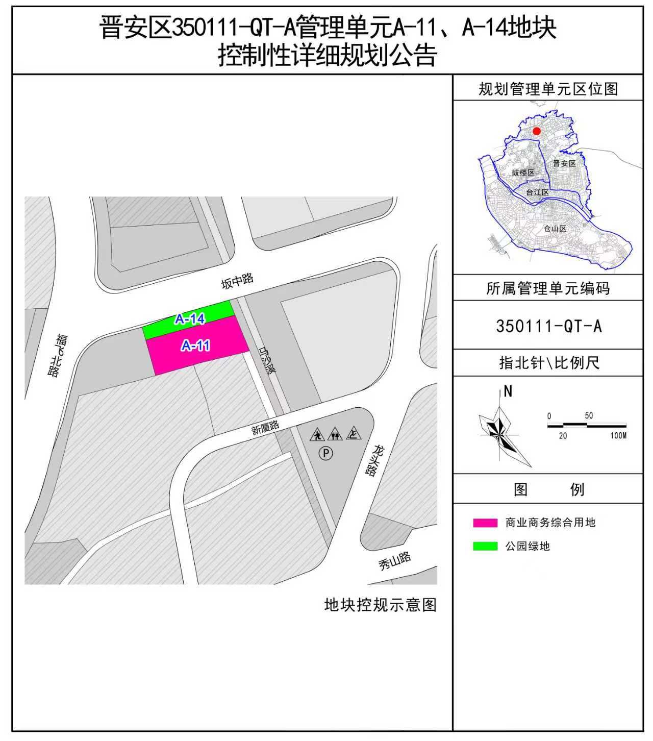 关于晋安区350111-QT-A管理单元A-11、A-14地块控制性详细规划的公告