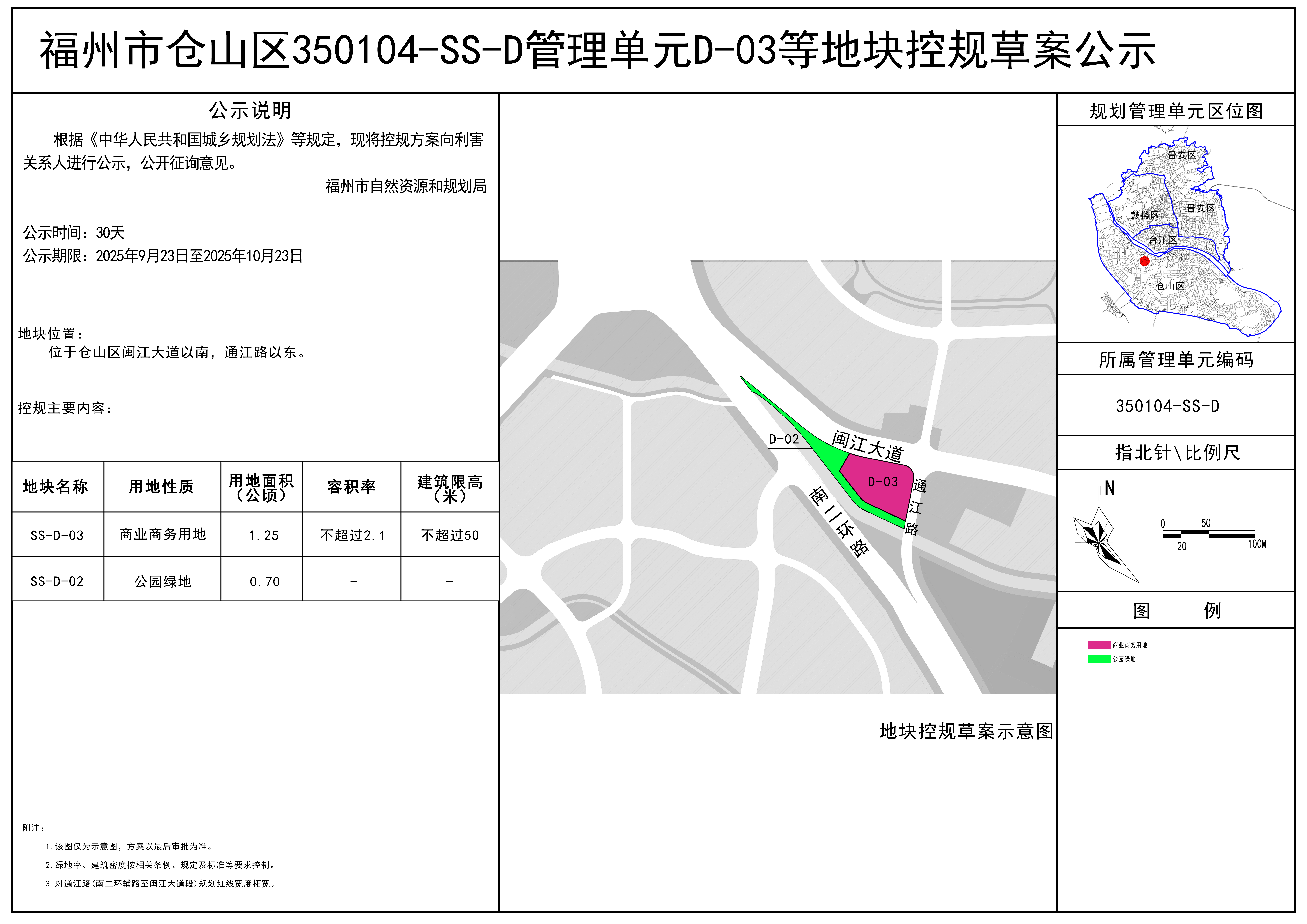 仓山区350104-SS-D管理单元D-03等地块位于仓山区,北至闽江大道,西南至洋洽河。该控规草案经研究审议,根据《中华人民共和国城乡规划法》等相关规定,现广泛征求社会各界意见,公示时间2025年9月23日至2025年10月23日,详情可查阅网站(http://zygh.fuzhou.gov.cn)。