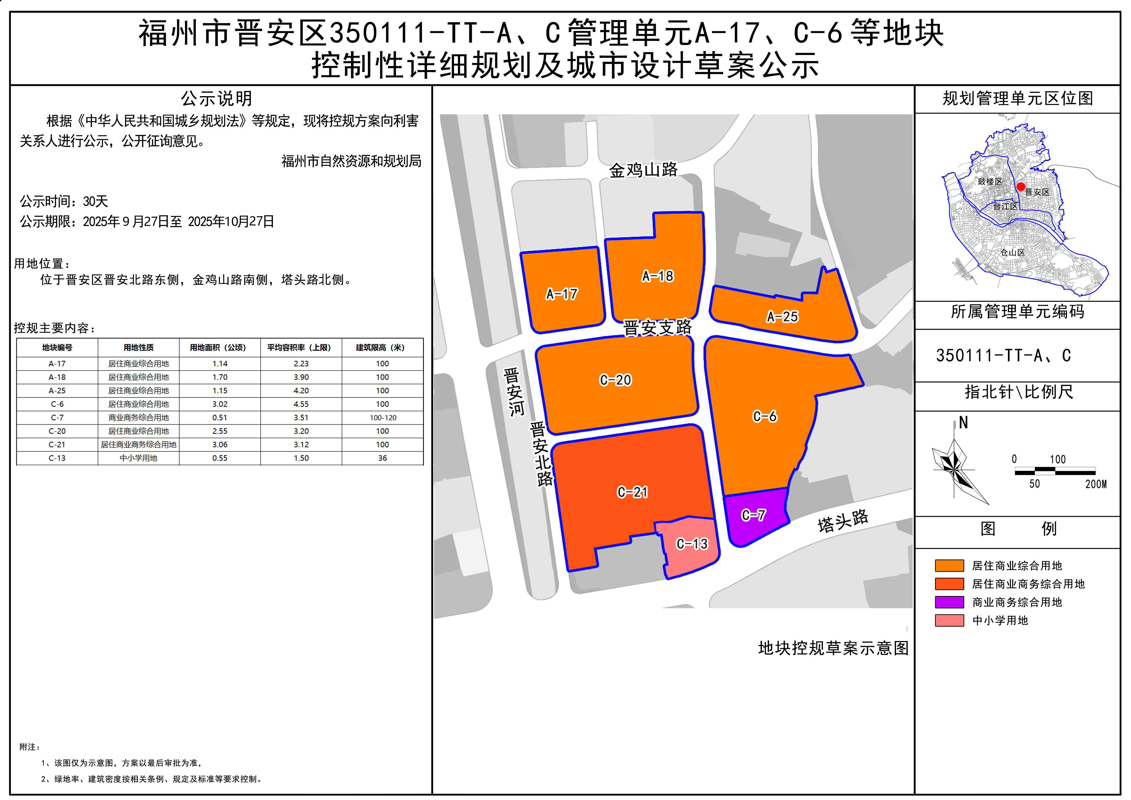 晋安区350111-TT-A、C管理单元A-17、C-6等地块位于晋安北路东侧、金鸡山路南侧、塔头路北侧。该控规及城市设计草案经研究审议,根据《中华人民共和国城乡规划法》等相关规定,现广泛征求社会各界意见,公示时间2025年9月27日至2025年10月27日,详情可查阅网站(http://zygh.fuzhou.gov.cn)。
