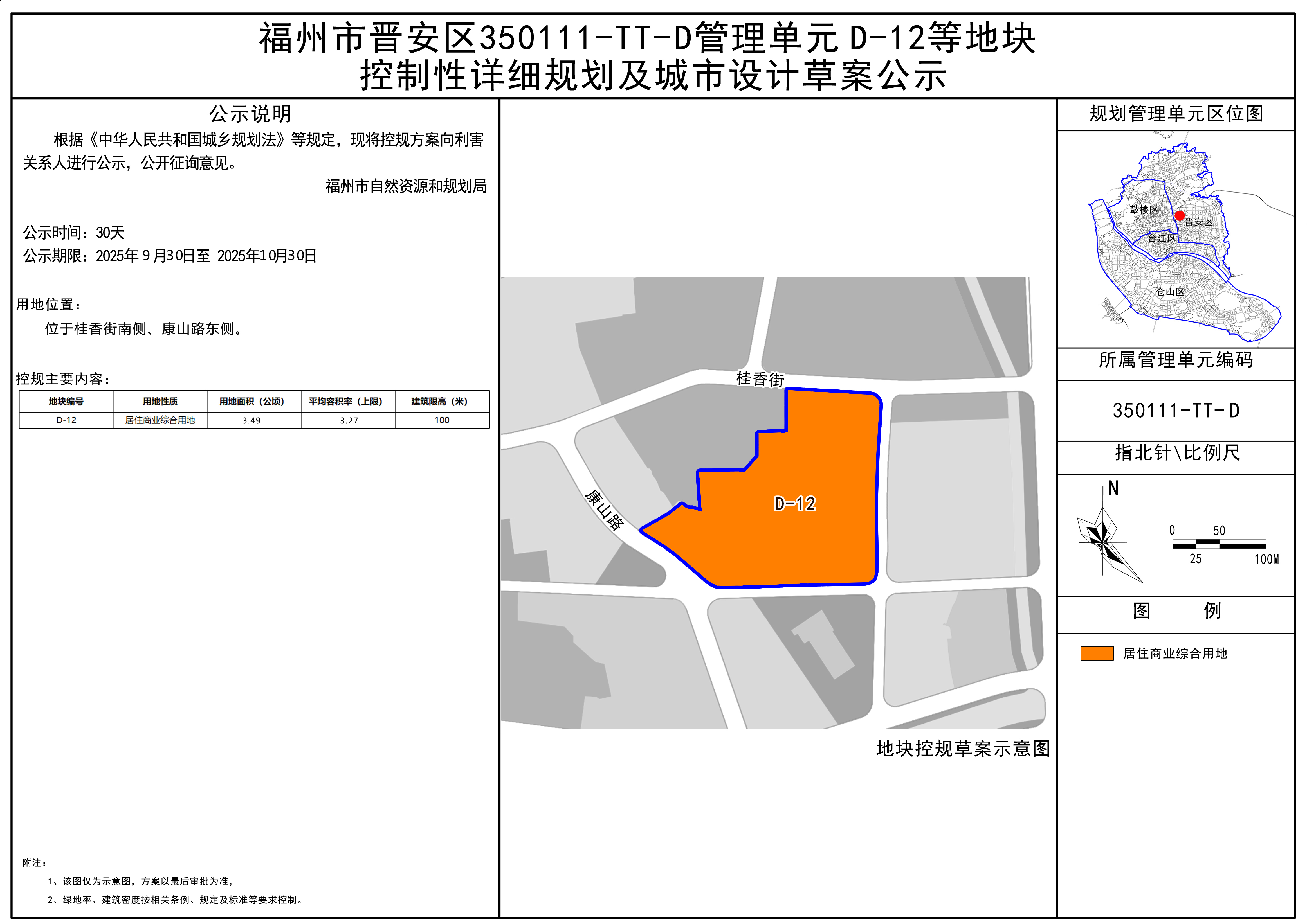 晋安区350111-TT-D管理单元D-12等地块位于桂香街南侧、康山路东侧。该控规及城市设计草案经研究审议,根据《中华人民共和国城乡规划法》等相关规定,现广泛征求社会各界意见,公示时间2025年9月30日至2025年10月30日,详情可查阅网站(http://zygh.fuzhou.gov.cn)。