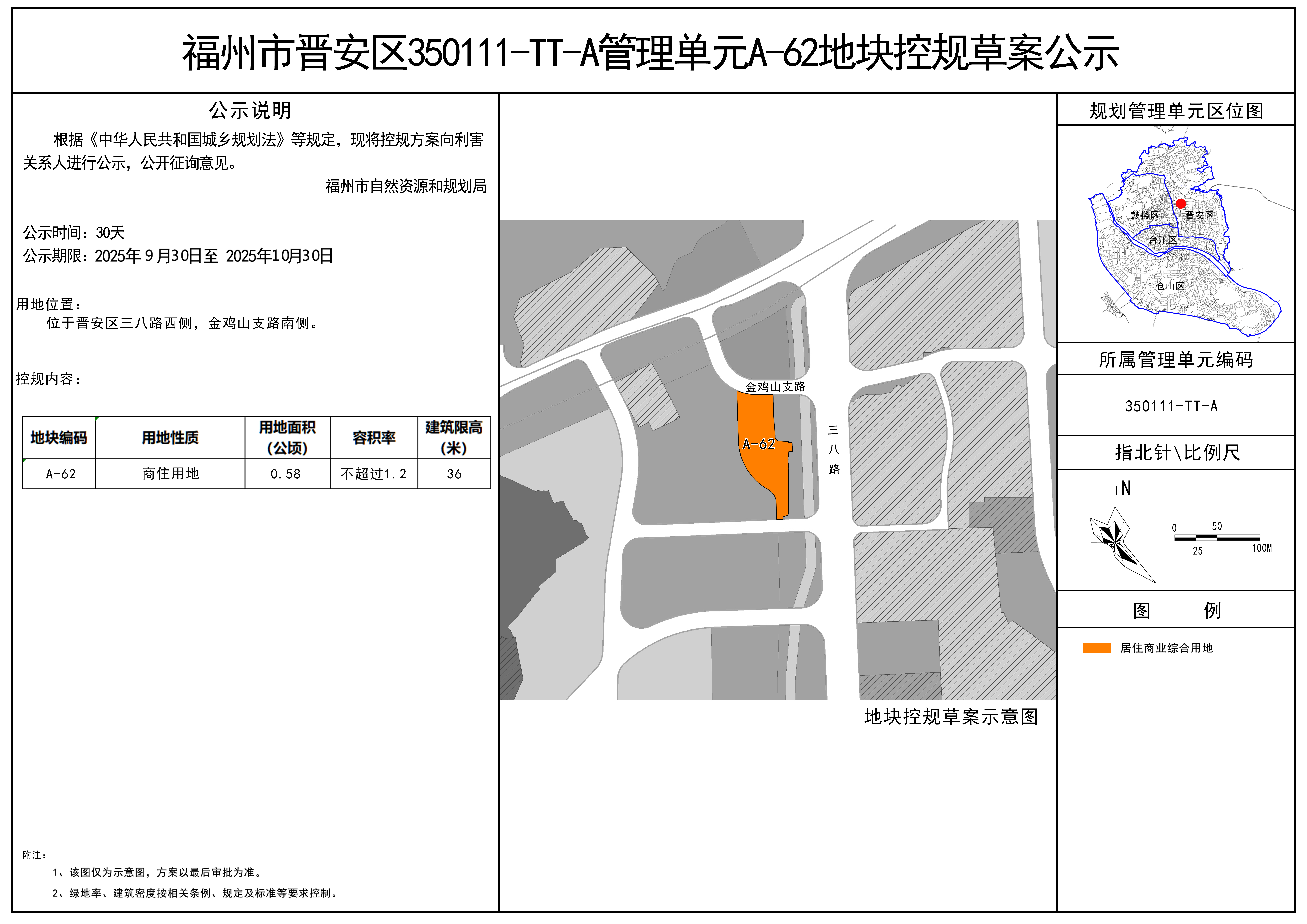 晋安区350111-TT-A管理单元A-62地块位于三八路西侧、金鸡山支路南侧。该控规草案经研究审议,根据《中华人民共和国城乡规划法》等相关规定,现广泛征求社会各界意见,公示时间2025年9月30日至2025年10月30日,详情可查阅网站(http://zygh.fuzhou.gov.cn)。