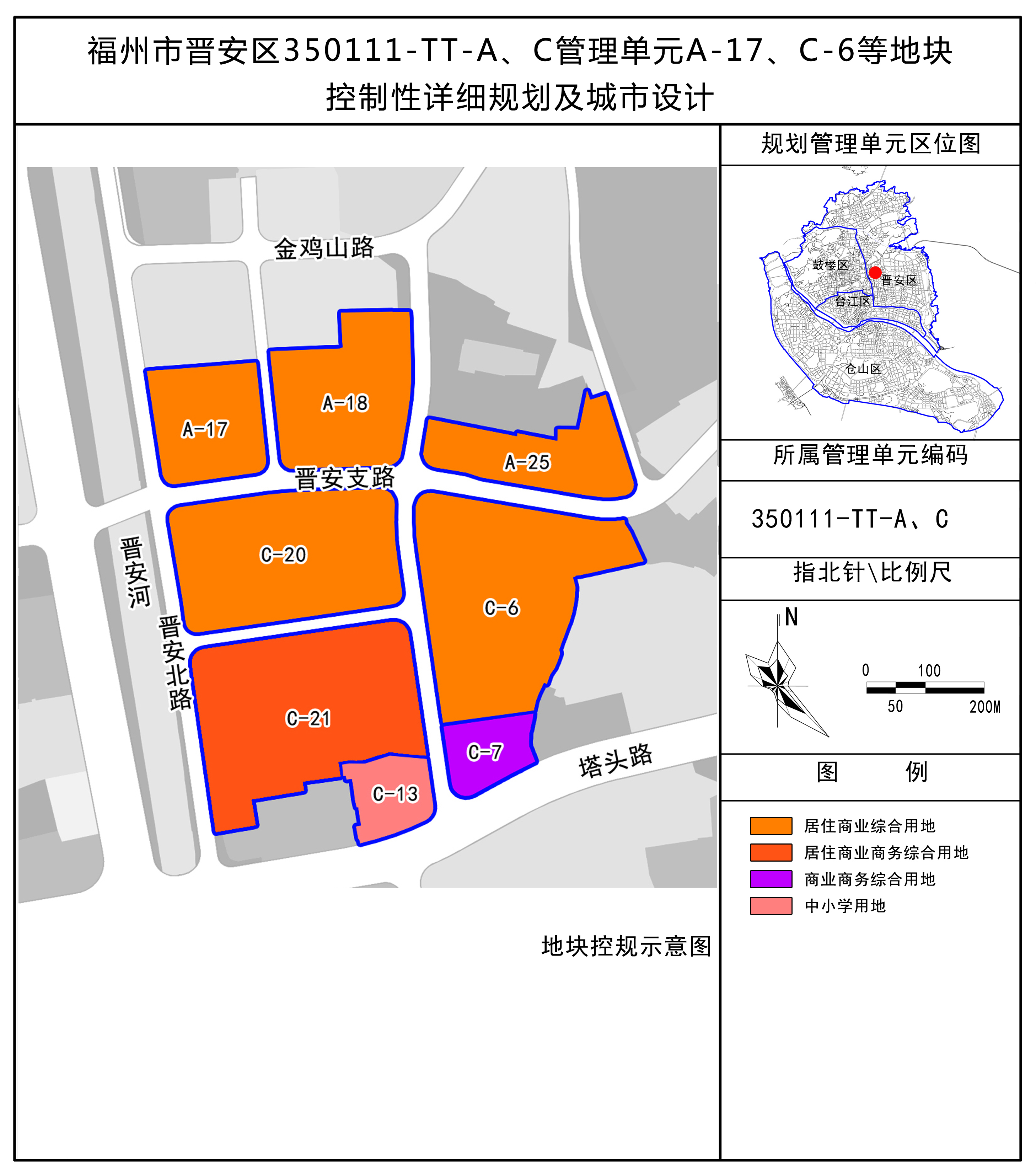 福州市晋安区350111-TT-A、C管理单元A-17、C-6等地块控制性详细规划及城市设计已经法定程序获得福州市人民政府批复,根据《中华人民共和国城乡规划法》等有关规定,现将经市政府批准的规划予以公布。