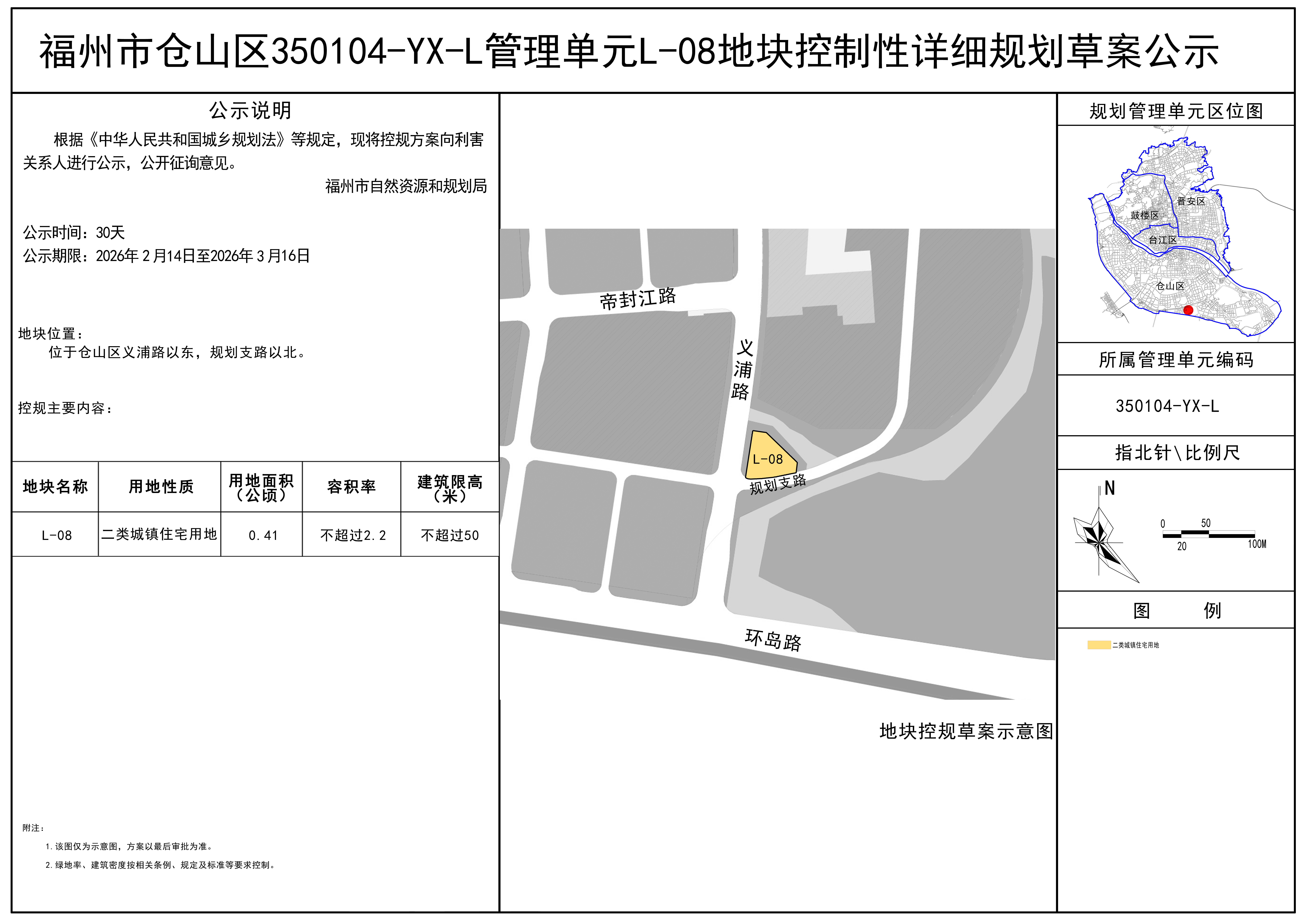 仓山区350104-YX-L管理单元L-08地块位于义浦路东侧,帝封江湿地公园西侧。该控规草案经研究审议,根据《中华人民共和国城乡规划法》等相关规定,现广泛征求社会各界意见,公示时间2026年2月14日至2026年3月16日。
