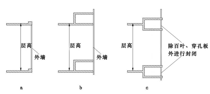 窗体未凸出于外墙的窗(图示中a、b)或窗体上(下)方凹入部分的外侧以各种类型建筑材料(不包括单纯以百叶、穿孔板)封闭的窗(图示中c)均不视为凸窗,该部分与套内其它部分一样计算层高,高度大于等于2.2m时,计算全面积。图示: