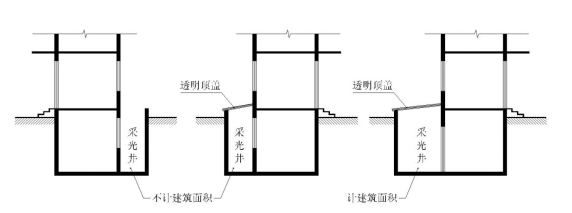 (三)采光井:与室内连通的有透明结构顶盖的地下室采光井,按其围护结构水平外围计算计容建筑面积;与室内不连通的有透明结构顶盖的地下室采光井及露天的地下室采光井不计建筑面积。图示: