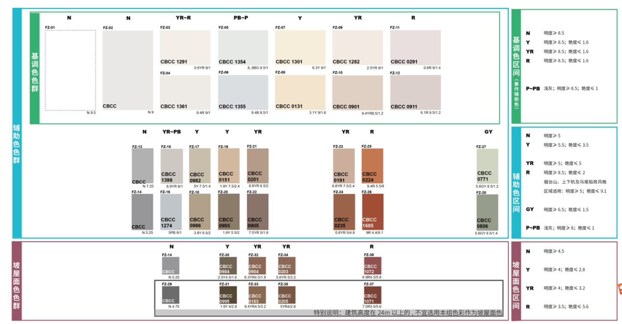 ②禁止选用前文所示的“总体禁用色谱”所列色彩作为建筑基调色、辅助色;