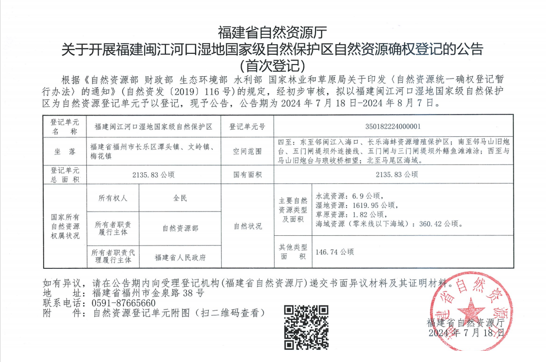 福建省自然资源厅关于开展福建闽江河口湿地国家级自然保护区自然资源确权登记的公告(首次登记)